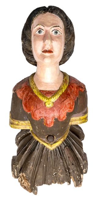 A 19th century Ship’s painted figurehead, in the form of a young woman, torso length, staring fixedly ahead, in a dark brown dress, gathered at waistline, with red turn down collar and necklace, 41” overall. GC (some retouching to paintwork) Plate 2