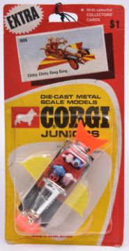 A scarce North American issue Corgi Juniors Chitty Chitty Bang Bang. (1006). A red/yellow carded, with printed $1, with clear plastic blister. Car with bright yellow fold out wings, with fluorescent orange front and rear wings, complete with all four figures. VGC-Mint. Minor wear to card, blister still sealed. £60-80