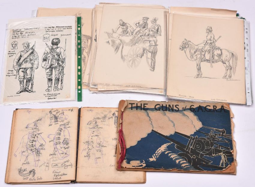 A quantity of annotated well detailed original pencil drawings, of German, Eastern European and other military uniforms, mostly A4 size, some smaller, a few hand coloured and a few in ink, approximately 65 in all; a note book containing numerous hand drawn details and notes in German of the uniforms of the Army of Frederick the Great in 1787 (very "dog eared"); and "The Guns of 6.A.G.R.A.", a booklet of prints of pencil drawings by F. Ward of 6 Army Group Royal Artillery in action in WWII. FC (very worn)