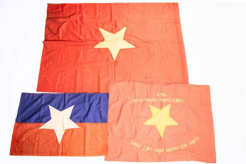 3 Vietcong flags, 28" x 20" with embroidery and applique; 24" x 16" white applique star on red and blue; 42" x 30" red with yellow star. £70-80