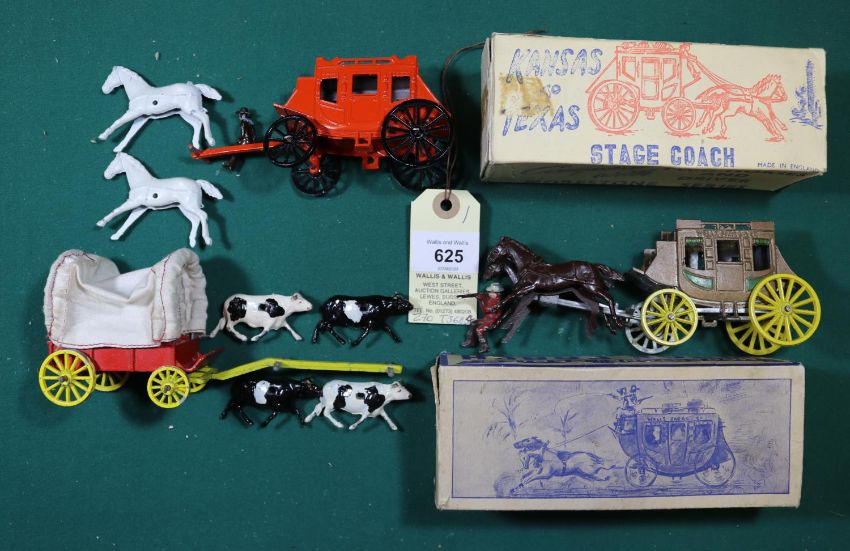 3 British made Stagecoaches. Benbros covered wagon, red body with yellow chassis and original cloth hood, this is an early set that contains 4 bullocks. Morestone Kansas to Texas stagecoach complete with two horses and driver, and a Morestone stagecoach with galloping horses and cowboy. Morestone boxes have wear, some staining and creasing. GC-VGC. £60-£80. (3).