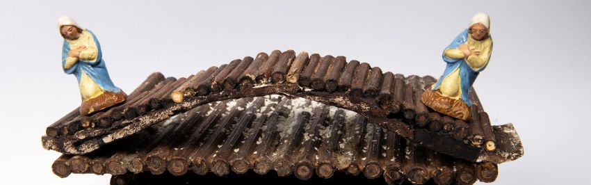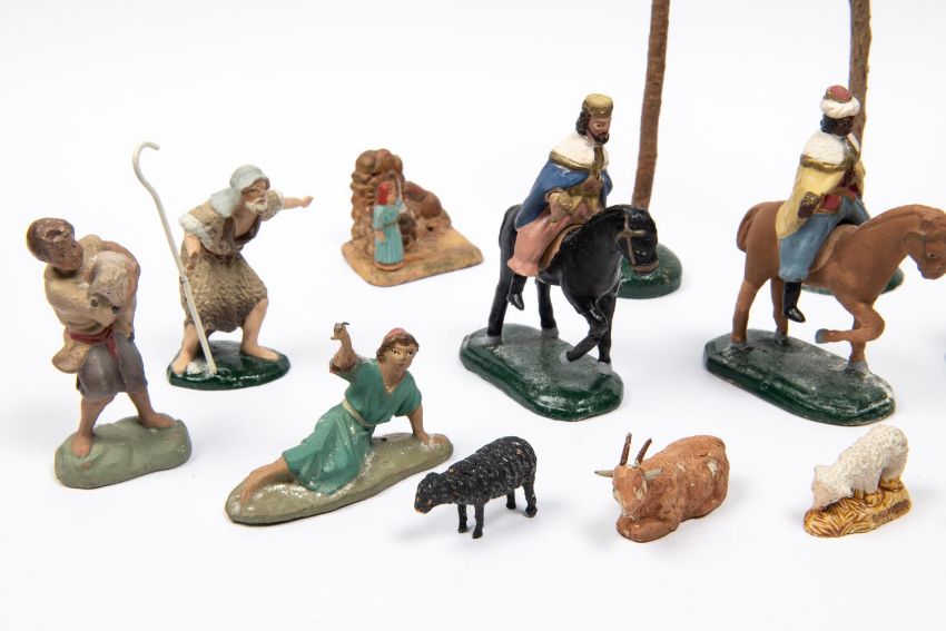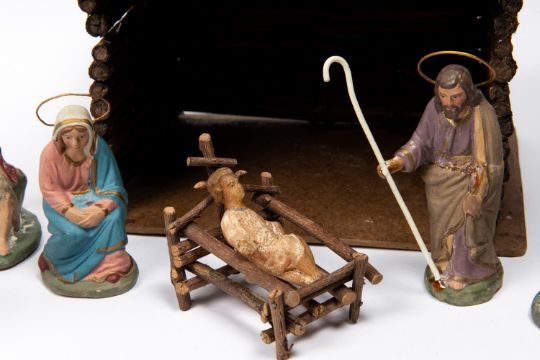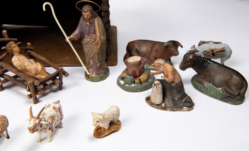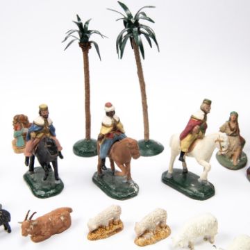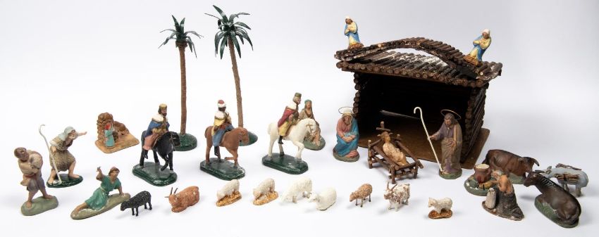 A Nativity Set. 1930s/40s Spanish 25 piece Nativity set in painted clay/composite material. Featuring Mary, Joseph, 3x Kings, Shepherds, animals, stable, etc. (Figure of Joseph approx 100mm). Together with 2x smaller scale figures of Mary and other religious figures. GC for age, some damage and repairs plus later additions, etc. £80-120