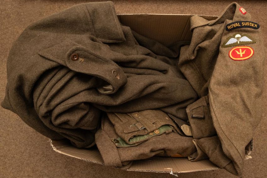 2 post WWII khaki BD uniforms, both comprise jackets and trousers, one has RMA Sandhurst insignia; another jacket with Royal Sussex officers insignia; a khaki greatcoat. Mostly VGC £30-40