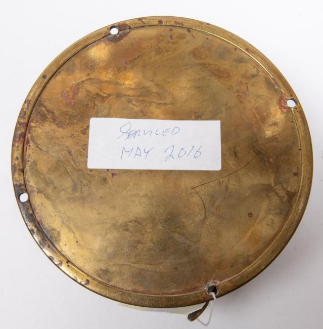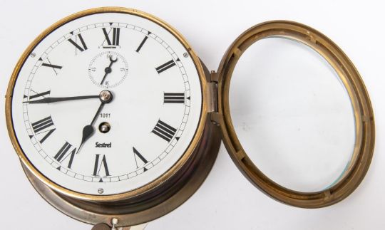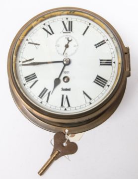 A brass bodied bulkhead/ship's clock, by Sestrel, Roman numerals, with regulator slot above seconds indicator, dial numbered 1011, diameter 8", glass window, complete with key. Vendor states: taken from HMS Speedy (P296), this was the first hydrofoil to be commissioned for service in the Royal Navy in 1980, further internet details and image supplied with lot. £100-150