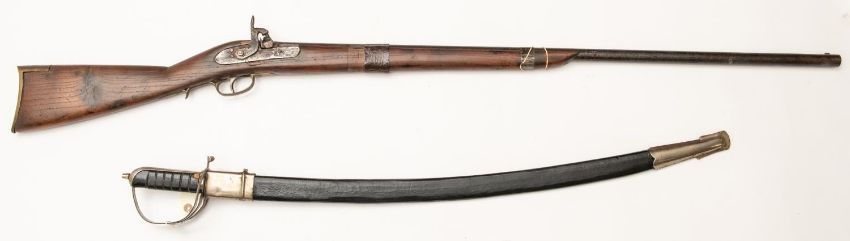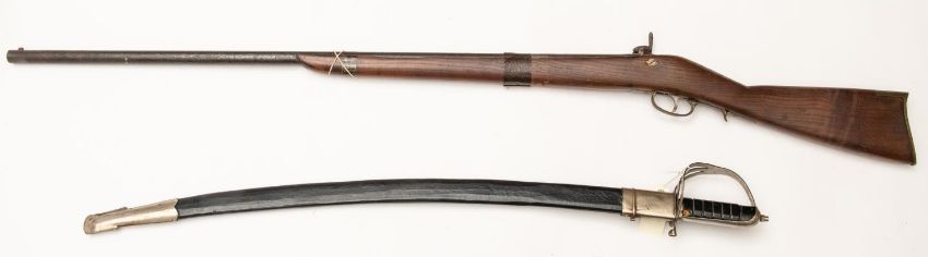 A crude Indian tourist percussion musket, 53" overall; and a modern Indian sword, the blade etched with scrolls and "Made in India", in its scabbard. (2) £40-50