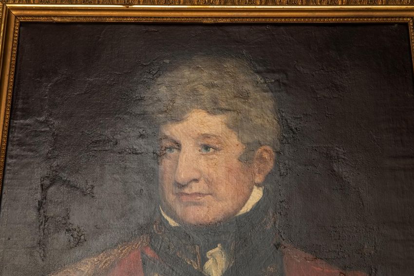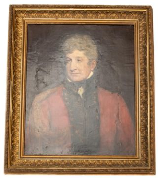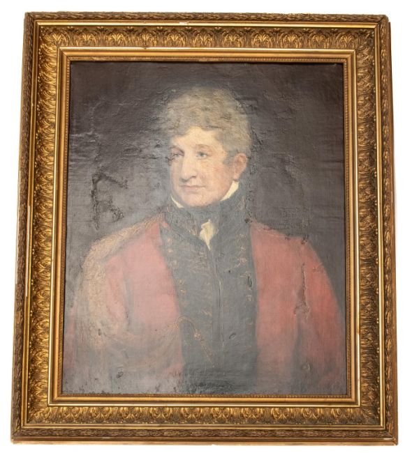An impressive oil on canvas portrait of an unidentified British late 18th/early 19th century General officer, half length, wearing scarlet tunic with aiguilettes, 23½" x 29", in gilt frame GC (some restoration) £400-500