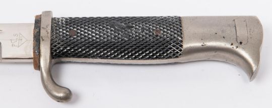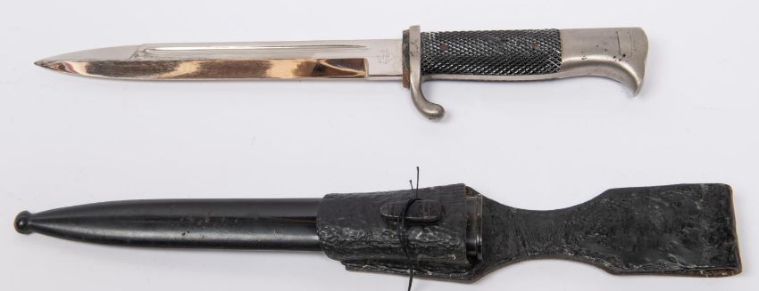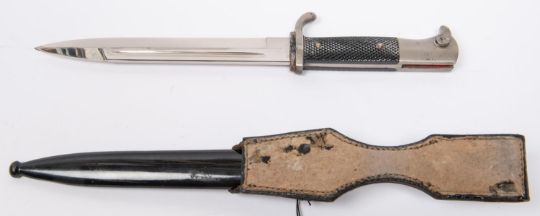 A Third Reich period German dress bayonet, by PS, Solingen, plated blade 7½", plated hilt with chequered black grips, in its black painted scabbard with patent leather frog. GC, blade VGC (hilt plating slightly dull, patent leather crazed). £40-60