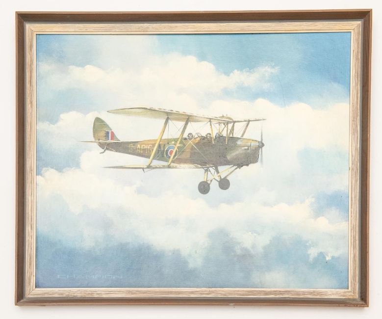 A modern oil on board of a WWI bi-plane, by Champion, signed in the bottom corner, 22" x 18", VGC £70-100