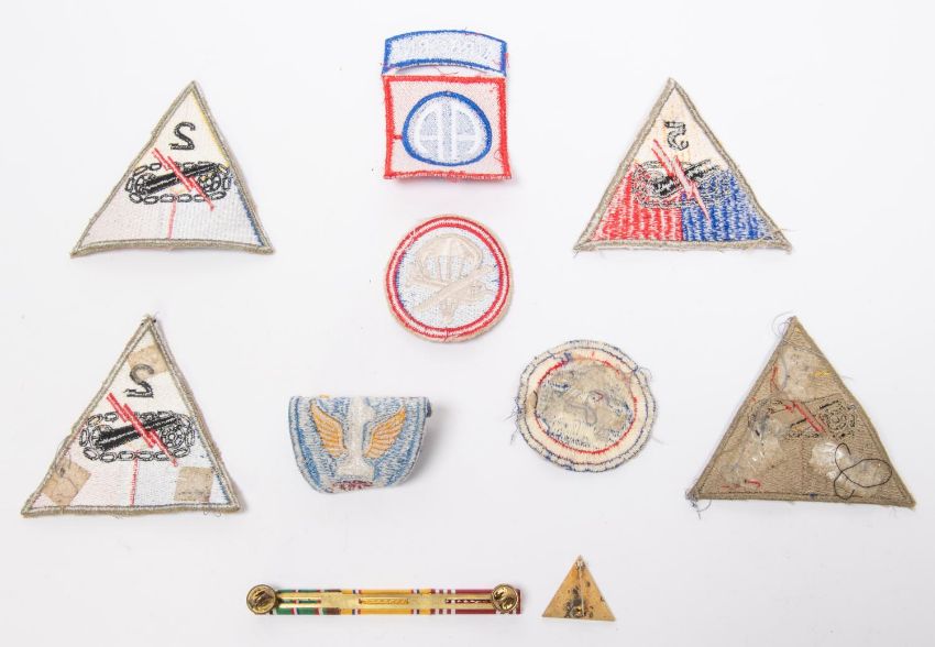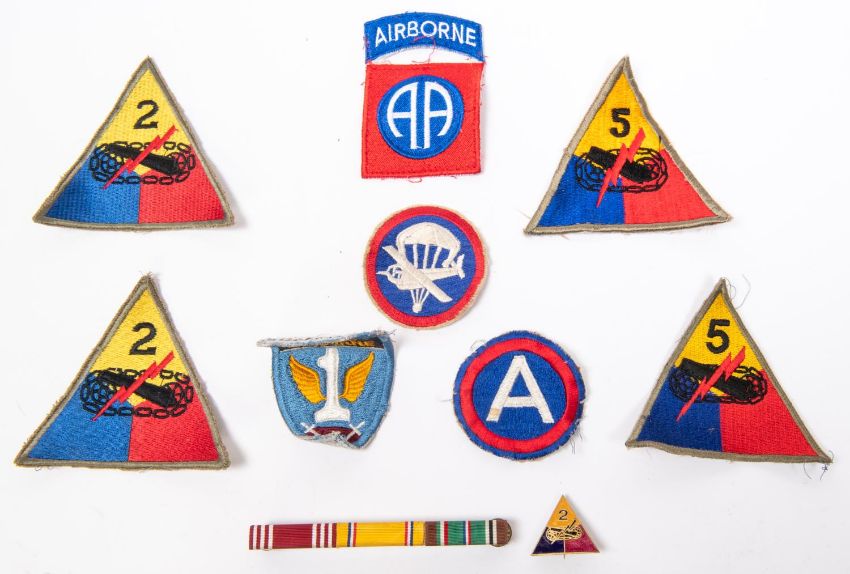 8 WWII or later US Army Divisional patches, a 2nd Armoured enamelled badge and ribbon bar. GC £40-50